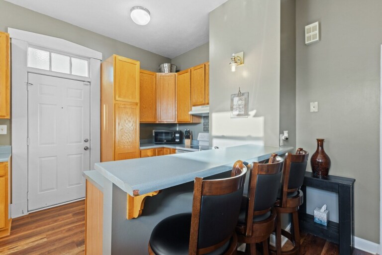 Kitchen: A fully-equipped, eat-in kitchen with a breakfast bar, refrigerator, stove/oven, dishwasher, and microwave.